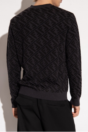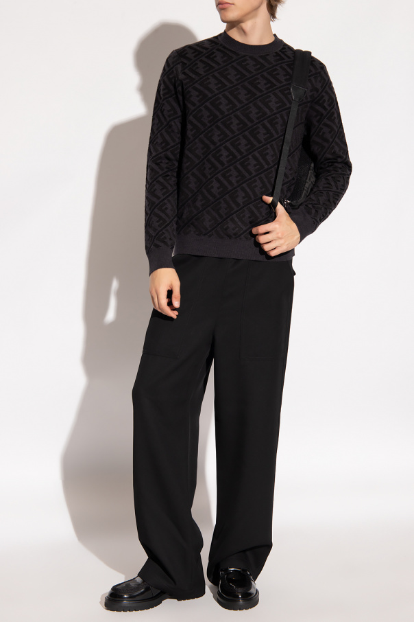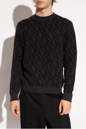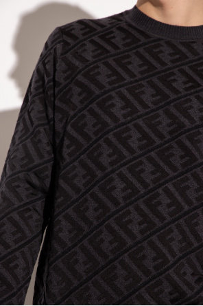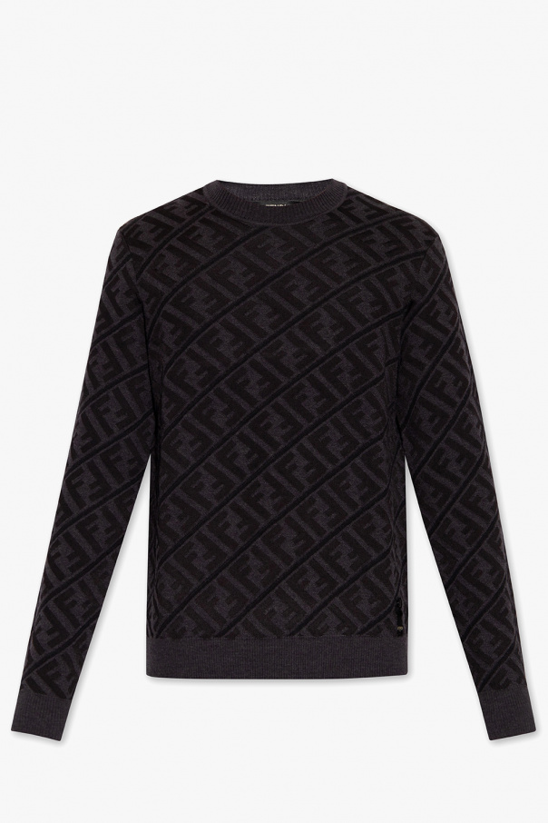Fendi的深灰色和黑色毛衣,圆领设计,采用羊毛和粘胶纤维混纺面料制成,饰有字母组合图案和罗纹边。