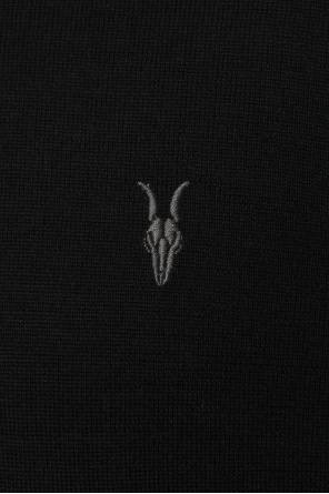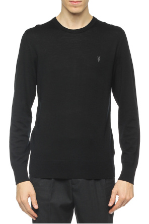AllSaints的黑色Mode毛衣。美利奴羊毛制成。正面饰有灰色logo绣花。圆领。弹性领,下摆和袖口。