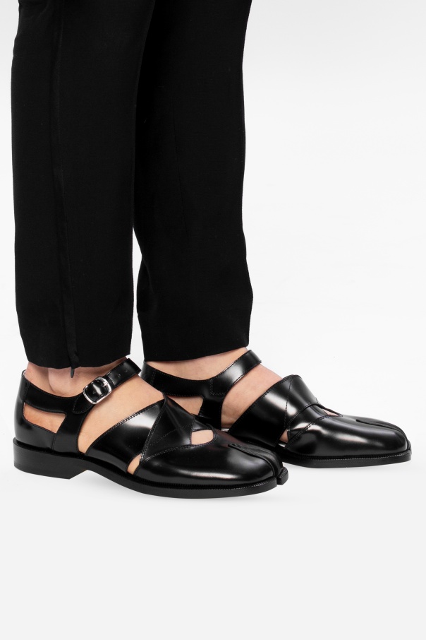 Maison Margiela的黑色皮质鞋,搭扣踝带,饰以挖剪细节。米黑色皮质鞋底。