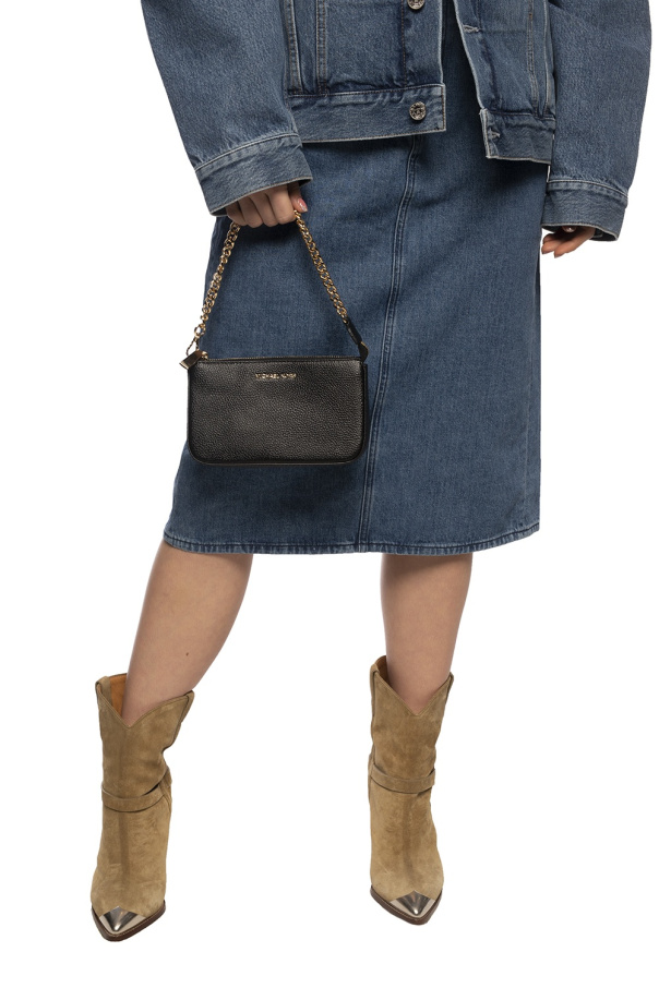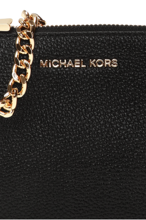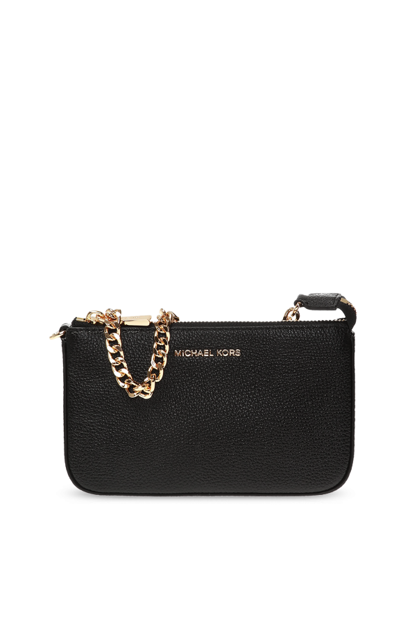 Michael Kors的黑色Jet Set手提包,采用纹理皮革制成,拉链开合,饰以金属logo。可拆卸链式肩带。内有一个主要分层、一个插袋、三个卡位。金色金属配件。