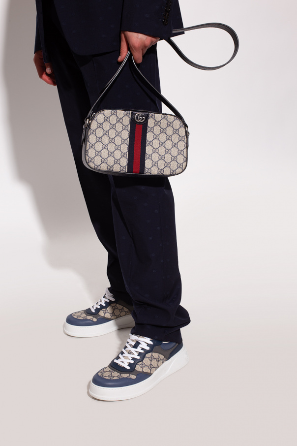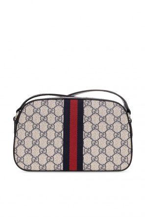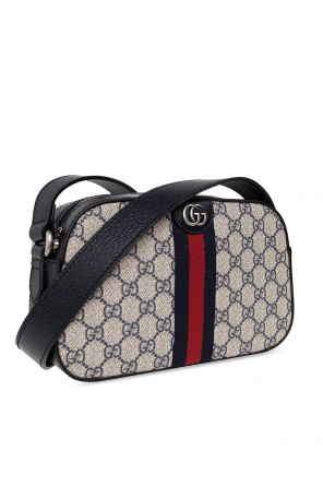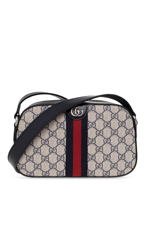 Cream and navy blue ‘Ophidia’ shoulder bag from Gucci. Crafted from the brand's signature GG Supreme canvas and trimmed with leather, this design secures with a zip and features Double G hardware, navy blue and red Web stripe detailing, an adjustable shoulder strap, antiqued silver-tone metal elements and one internal compartment with a slip pocket.