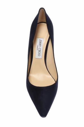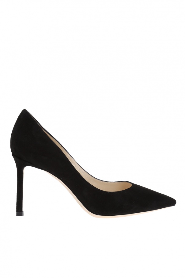 这款深蓝麂皮Romy 85尖头细高跟鞋来自Jimmy Choo,配有米色麂皮鞋底。