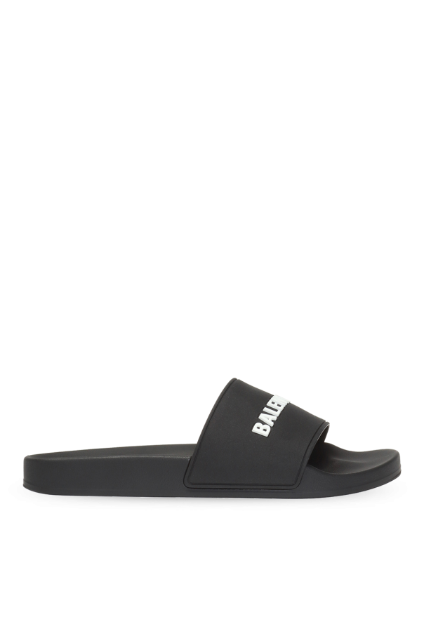 Balenciaga的黑色拖鞋。采用白色凸起徽标装饰。