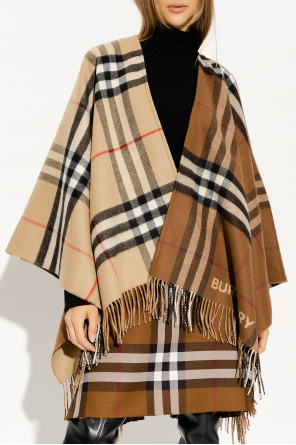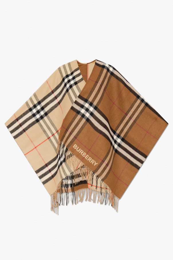 Beige and brown poncho from Burberry. Crafted from a wool and cashmere blend, this item showcases the brand's signature colourful check pattern and a fringed hem.
