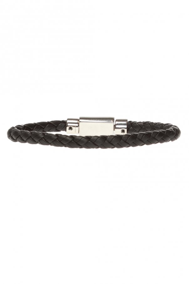 Salvatore Ferragamo的黑色编织手镯。牛皮革制成。附含银色logo的装饰性扣。