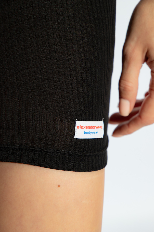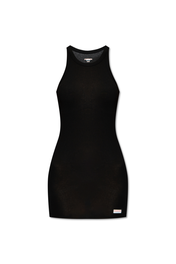 Black mini dress from Alexander Wang, the ‘Bodywear’ collection. Made of ribbed cotton, this sleeveless design features a logo patch and a round neck.