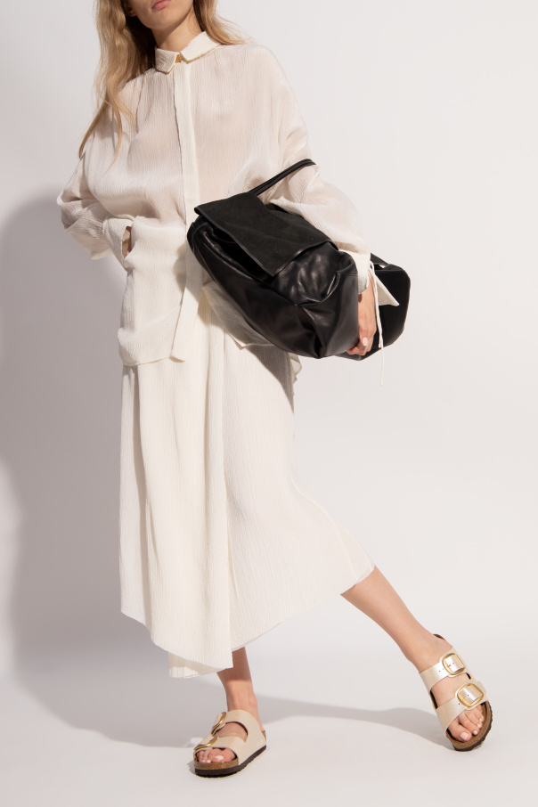 Birkenstock的奶油色Arizona Big Buckle拖鞋,采用Birko-Flor特殊材质制成。logo压花搭扣带设计。棕色鞋底利用天然栓皮和EVA泡棉打造。