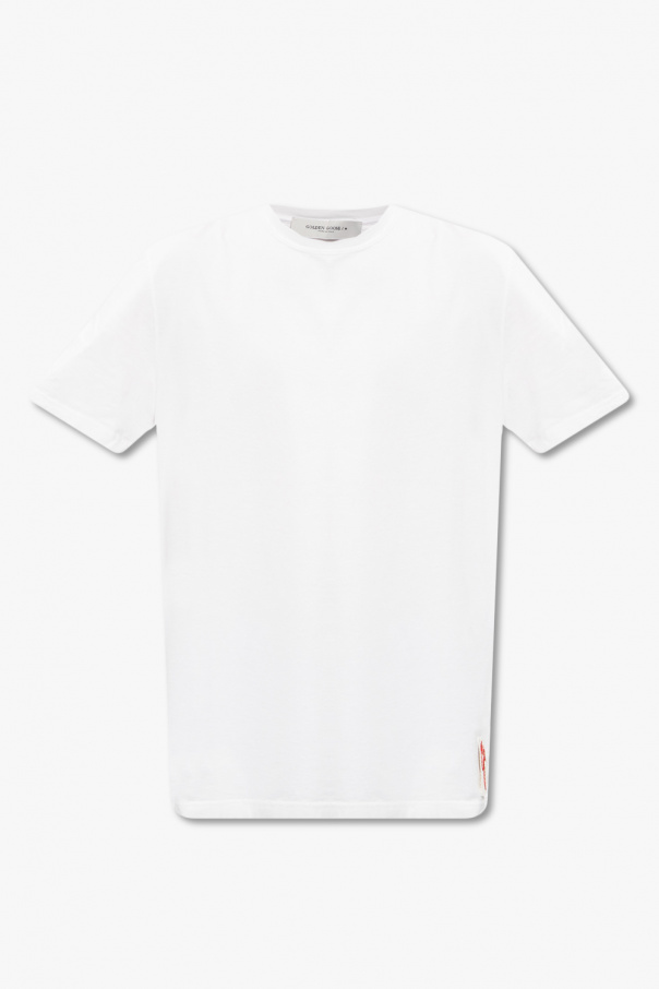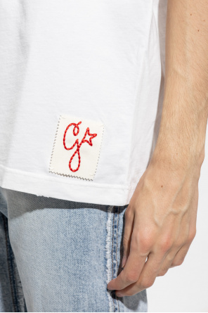 Golden Goose的白色仿旧效果T恤,短袖,采用棉质面料制成,饰有白色和红色徽标贴片、罗纹圆领。短袖,翻上袖口。