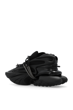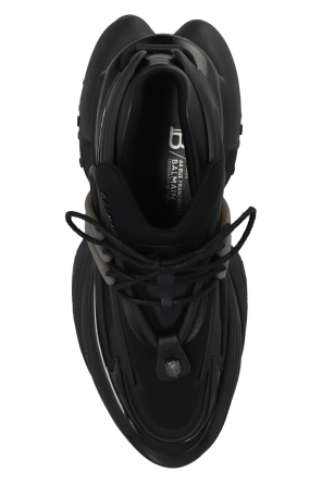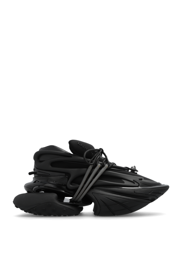 Black ‘B-Bold’ sneakers from Balmain. Crafted from leather and fabric overlays, this lace-up model sits on a black rubber sole and showcases a tonal black graphic print with the brand's logo.