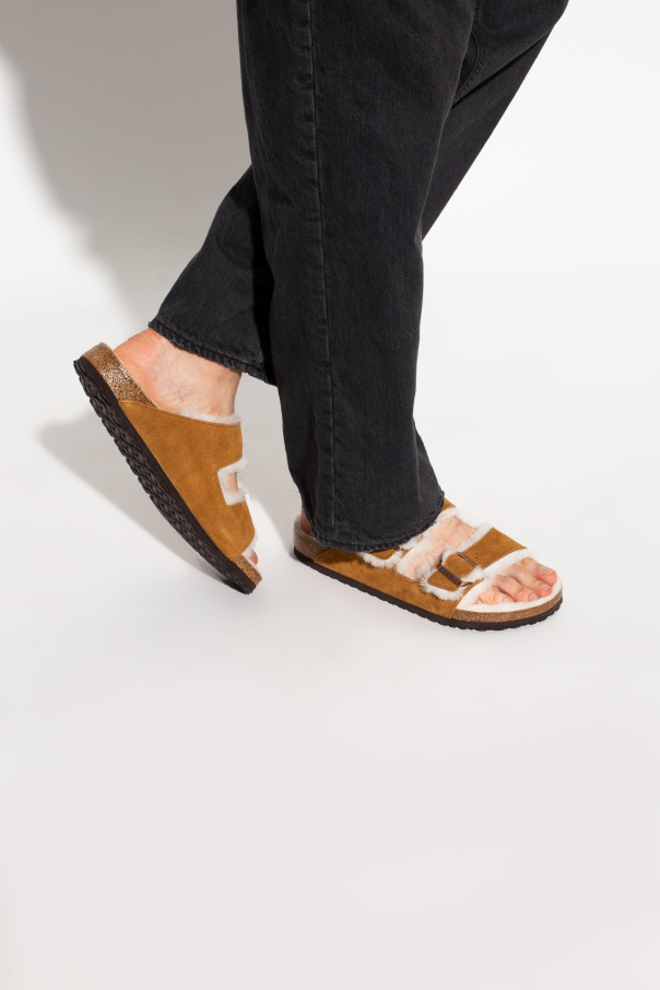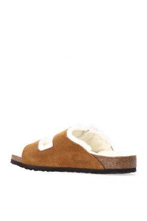 Birkenstock的棕色调Arizona BS拖鞋。绒面革质。棕色调天然软木及EVA泡沫质鞋底。饰带含铜色调搭扣,且含logo。