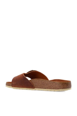Birkenstock 复古效果棕色“Madrid Big Buckle”拖鞋。 这双鞋采用涂油皮革制成,配有带金色搭扣的可调节肩带,以及由软木和 EVA 泡沫制成的奶油色和棕色鞋底。