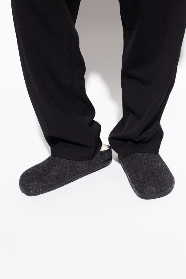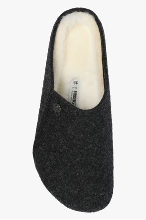 Birkenstock的灰色及白色调Zermatt Rivet拖鞋。兔毛毡质。附logo。皮草衬里。黑色调轻质软木及橡胶材质鞋底。