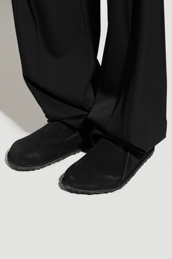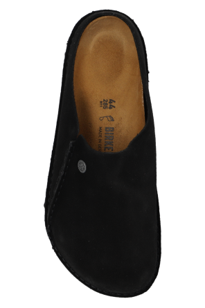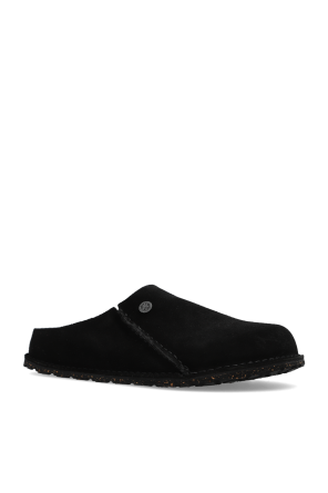 Black 'Zermatt Premium' slides from Birkenstock. Made of suede, this model sits on a black rubber sole and features an embossed logo on the side and an anatomically-shaped cork-latex footbed. Regular width.