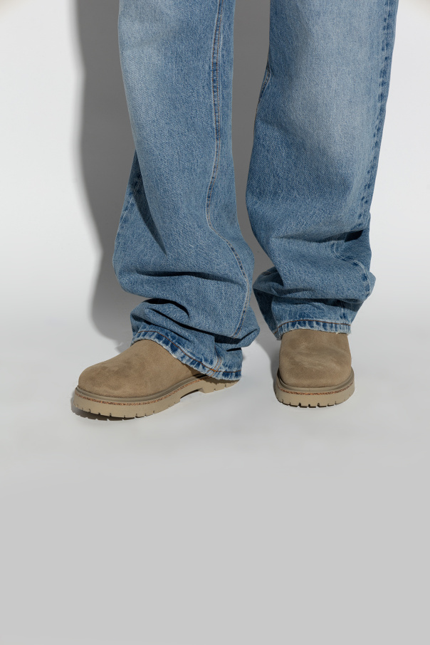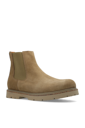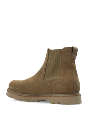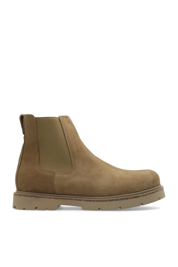 Beige 'Highwood' Chelsea boots from Birkenstock. Crafted from suede, this model sits on a beige rubber sole and showcases an embossed logo, ribbed elastic panels on the sides and a removable, anatomically shaped cork-latex footbed. Regular width.