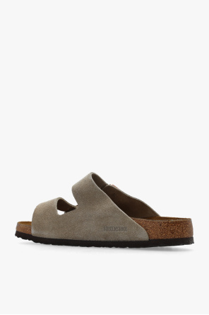 Greyish beige ‘Arizona BS’ slides from Birkenstock. Made of suede, this pair features adjustable shoulder straps, embossed logo, anatomically shaped cork-latex footbed and brown sole constructed from natural cork and EVA foam.