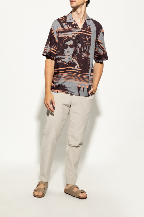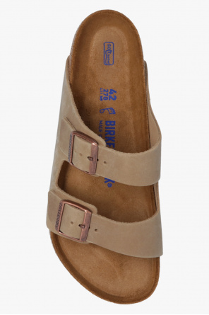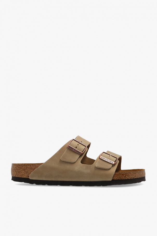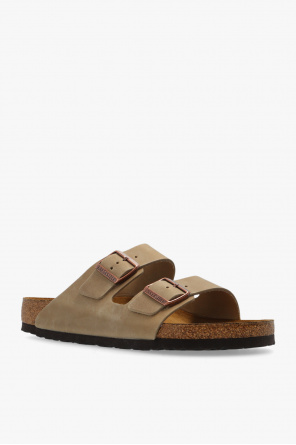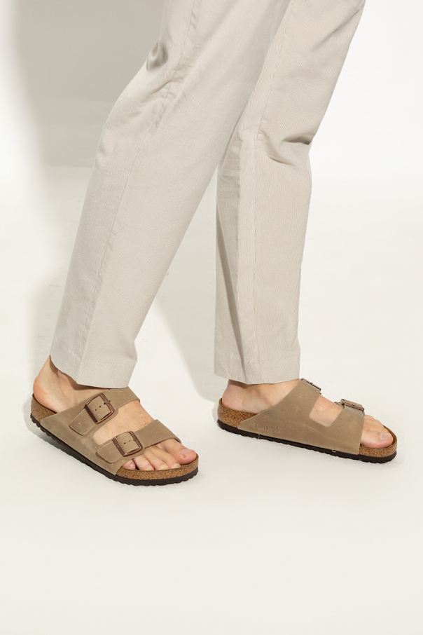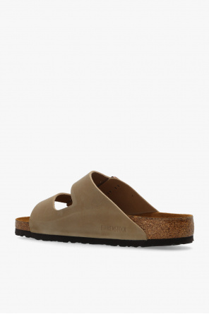 Beige ‘Arizona BS’ slides from Birkenstock. Crafted from oiled nubuck leather, this model features two adjustable buckle straps, an embossed logo on the side, an anatomically shaped cork-latex footbed and a brown natural cork sole with a brown EVA foam trim. Standard width.