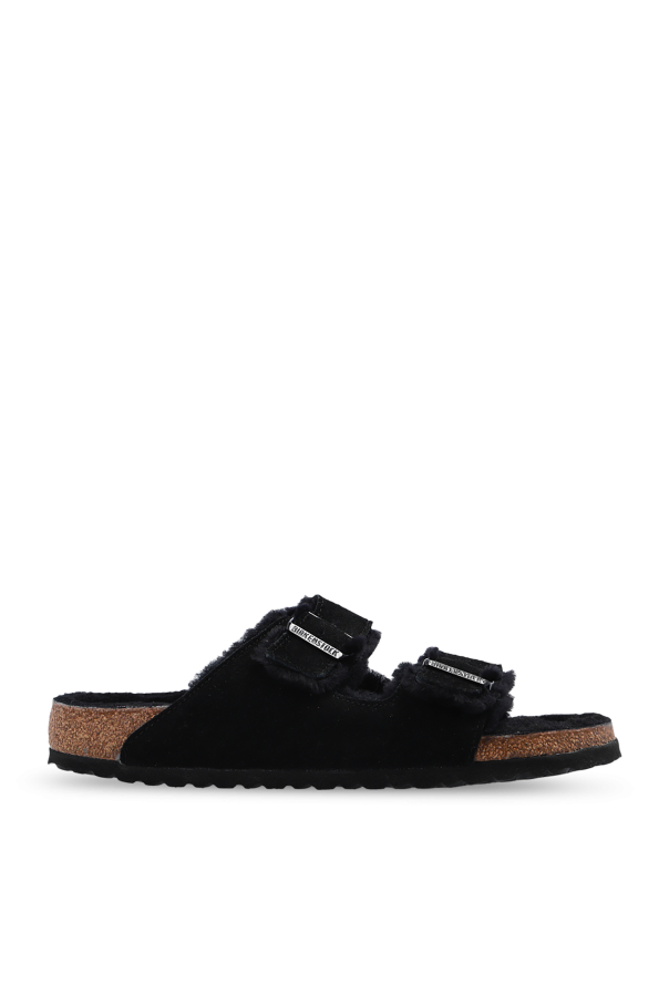 Birkenstock的黑色Arizona Shearling拖鞋。 这双鞋采用绒面革制成,肩带配有黑色徽标压花搭扣、羊毛皮衬里以及由软木和 EVA 泡沫制成的棕色和黑色鞋底。