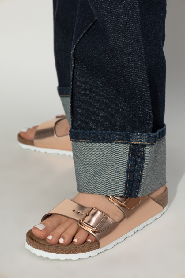Birkenstock的金色金属Arizona BS拖鞋。 此款采用皮革制成,配有带徽标压花搭扣的可调节肩带以及由软木和 EVA 泡沫制成的棕色和白色鞋底。