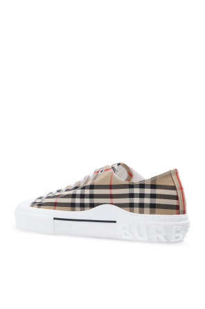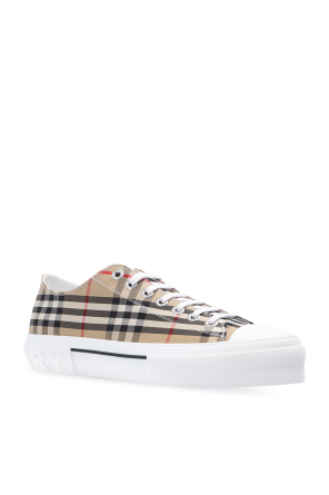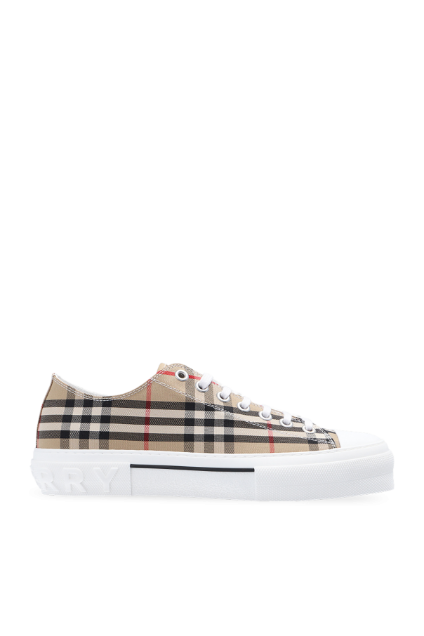 Beige sneakers from Burberry. Made of canvas with a colourful Vintage check pattern, this lace-up model features a logo print, raised logo detailing and a brown and white rubber sole.