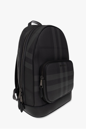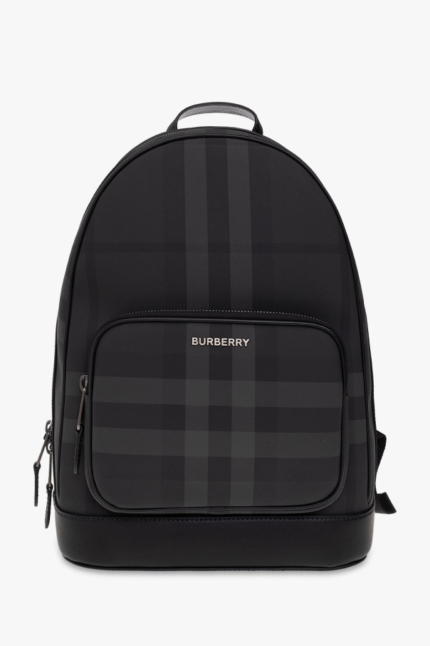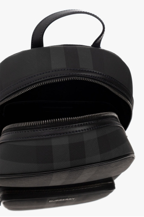 Black and grey ‘Rocco’ backpack from Burberry. Crafted from canvas with a signature, colourful check pattern, this design fastens with a two-way zipper and features a zip pocket accompanied with a metal logo plaque on the front, calf leather trims, a half-round handle, adjustable shoulder straps and one internal compartment with a slip pocket.