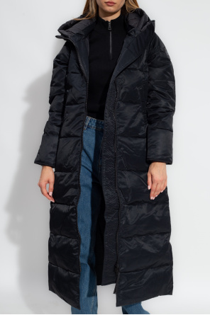 Long, black ‘Mystique’ hooded down jacket from Canada Goose. Made of fabric with a satin finish, this design features a two-way zip, logo patch on the shoulder, detachable hood with added insulation and reflective stripe at the back, two snap-fastened pockets, long sleeves with ribbed cuffs and internal shoulder straps with a logo. The jacket offers wind- and water-resistant properties and is warm enough to wear at temperatures below -30°C.