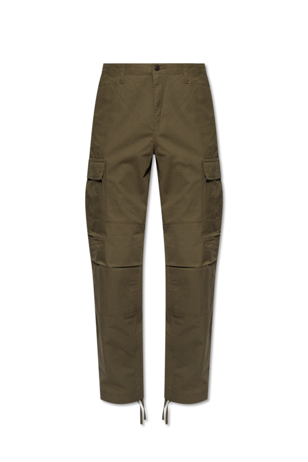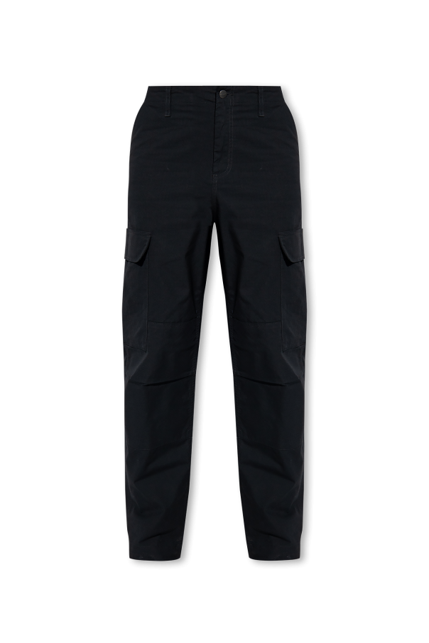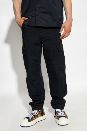 Black cargo trousers from Carhartt WIP. Made of cotton with a relaxed fit, this pair features a logo patch, a zip fly with a button, two slip pockets, four flapped pockets with snaps and drawstring cuffs.