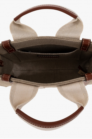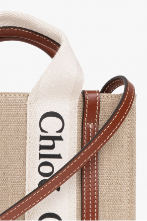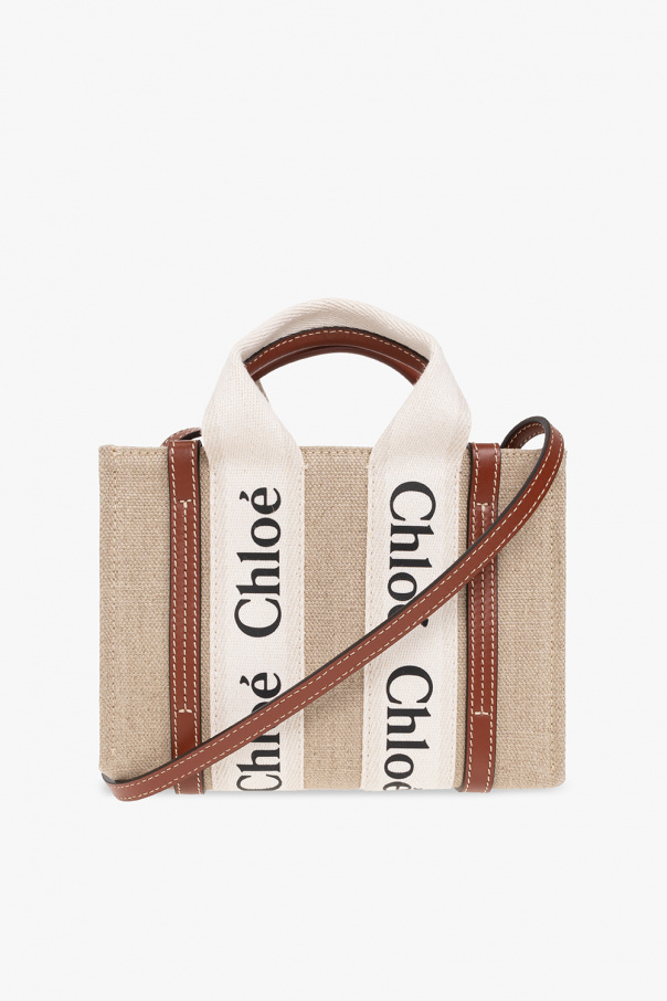 Beige, brown and cream ‘Woody Mini’ shoulder bag from Chloe. Crafted from linen and trimmed with calf leather, this design features a printed black logo, two half-round handles, an adjustable strap and one internal compartment with a slip pocket.