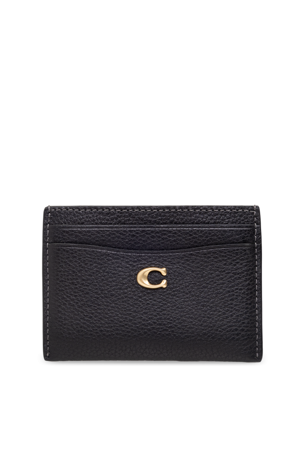 Black card case from Coach. Crafted from leather, this item features a gold-tone logo plaque on the front and five card slots.