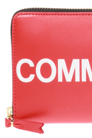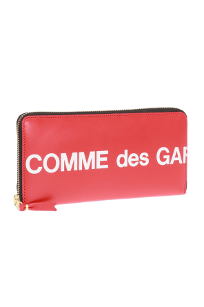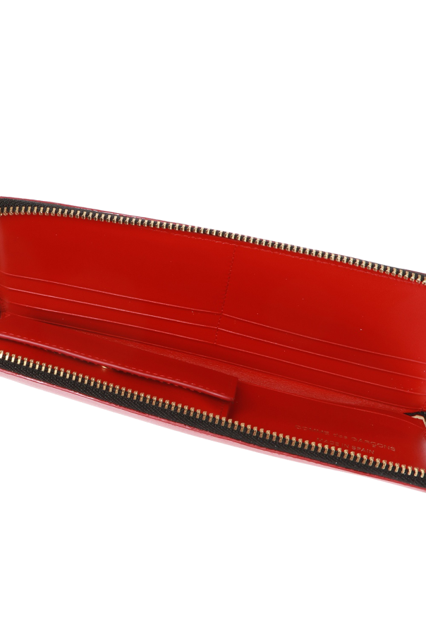 Comme des Garçons的红色真皮拉链钱包,饰以白色印花标识。内有一个钞票位、一个按扣零钱袋、两个插袋和六个卡位。