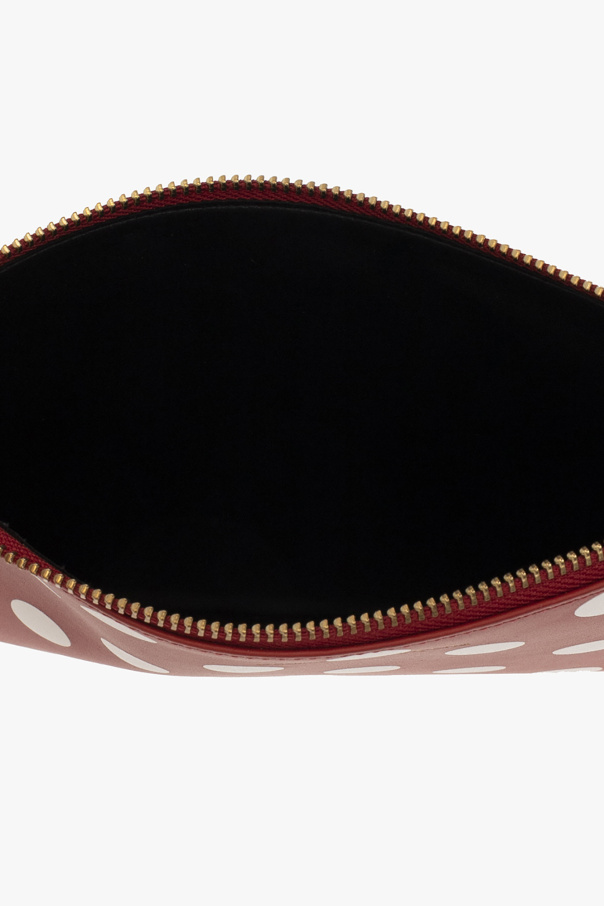 Red pouch from Comme des Garcons. Crafted from leather, this design features a white polka dot pattern, a zip fastening, a gold-tone logo print and one internal compartment.