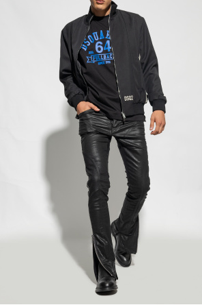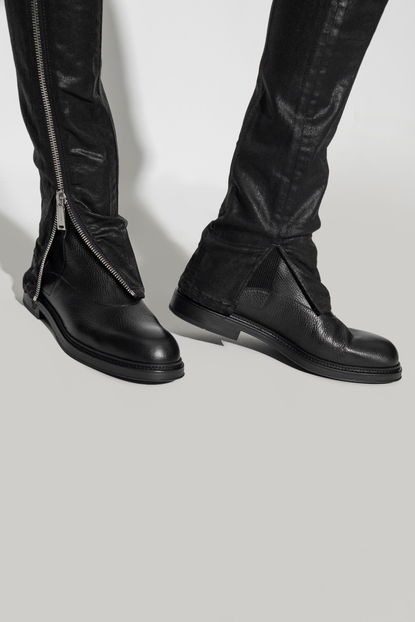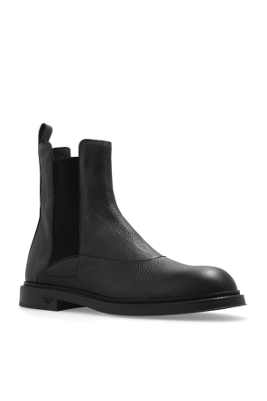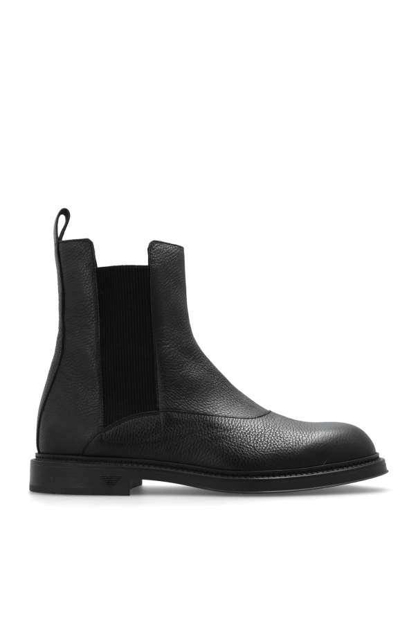 Black Chelsea boots from Emporio Armani. Made of grained leather, this pair features elastic side panels and a black rubber sole with a logo detail.