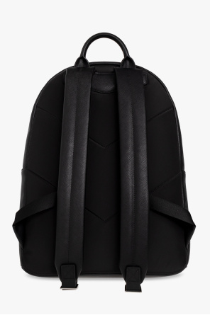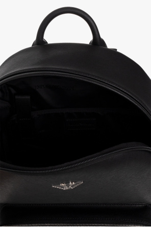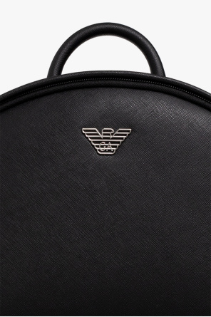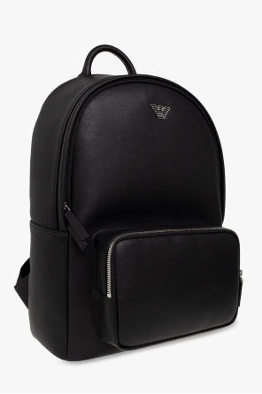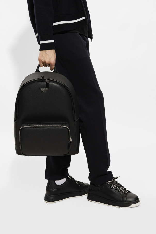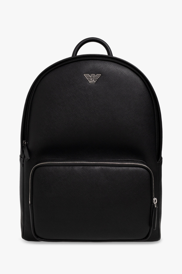 Black backpack from Emporio Armani. Made of faux leather, this item features a logo appliqué, front zip pocket, half-round handle, adjustable shoulder straps, silver-tone metal hardware and one internal compartment with three slip pockets.