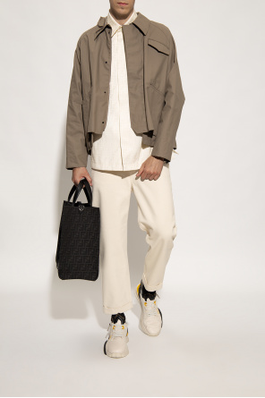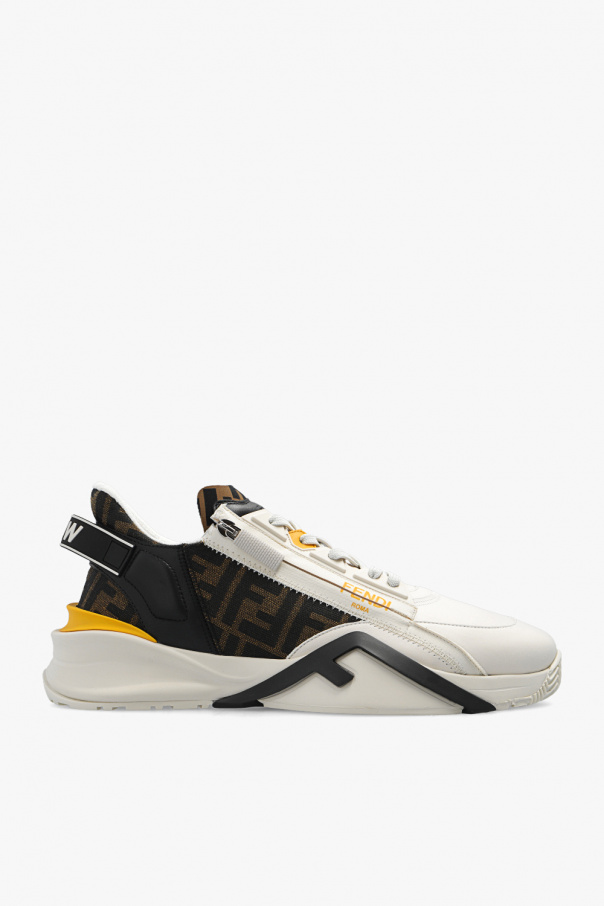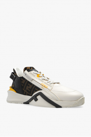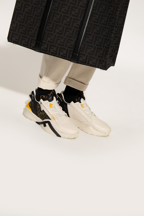 Cream, brown and black ‘Flow’ sneakers from Fendi. Crafted from leather and trimmed with rubber elements, this lace-up model sits on a cream and black rubber sole and features logo detailing on the tongue and side, a monogram jacquard motif on the side and a black and white applique with the model's name accompanied by a yellow logo application at the back.