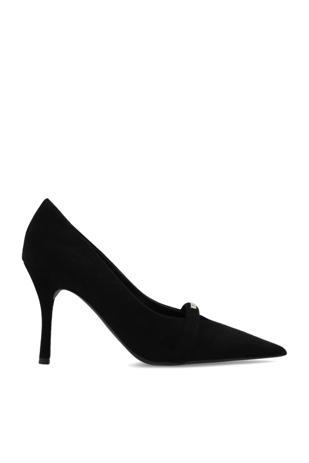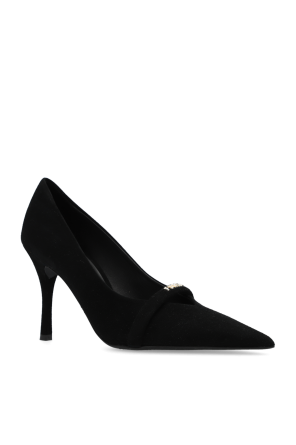 Black ‘Core’ pumps from Furla. Made of suede with a pointed toe silhouette, this model sits on a black rubber sole and showcases a strap and gold-tone logo hardware on the front.