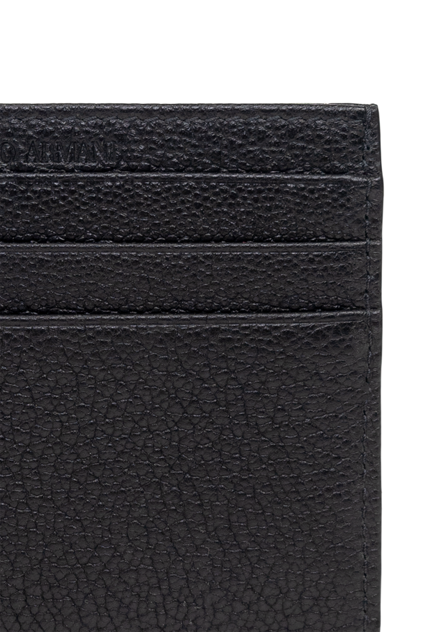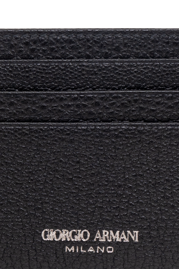 Black card holder from Giorgio Armani. Made of leather, this design features an embossed logo, six card slots and one internal compartment.