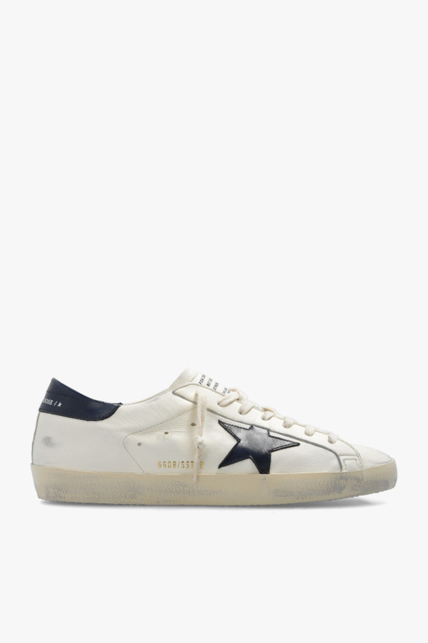Cream and navy blue ‘Super-star Classic’ sneakers from Golden Goose. Crafted from leather with a vintage effect, this lace-up model sits on a beige and cream rubber sole and showcases a logo print and a navy blue patch with a signature star.