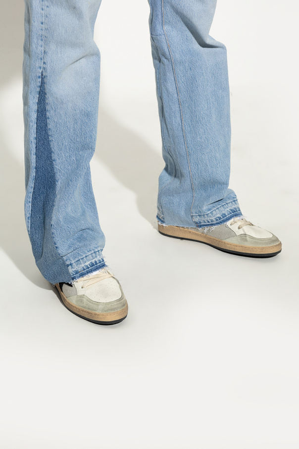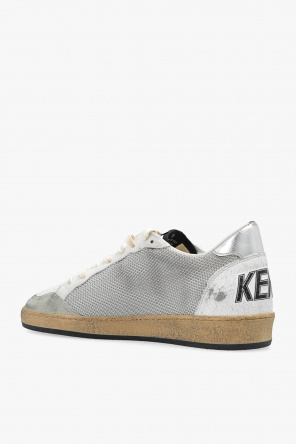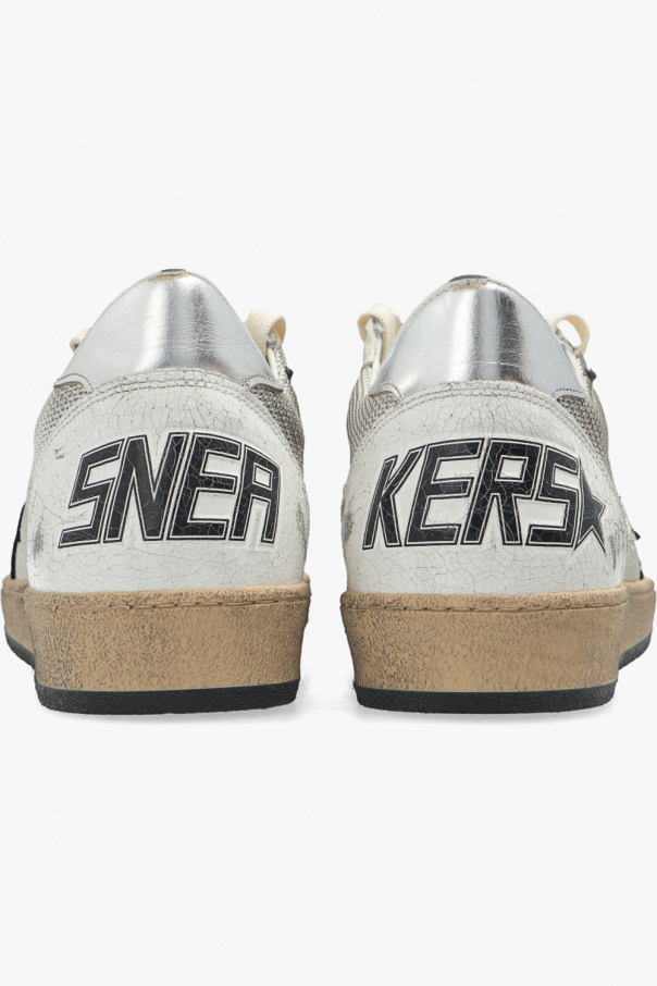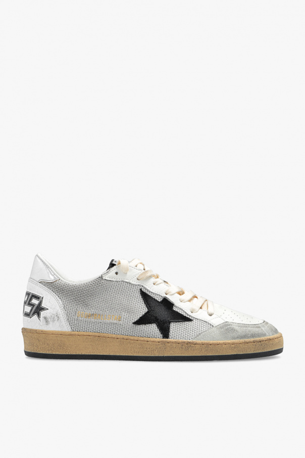 Grey, silver-tone and white ‘Ball Star’ sneakers from Golden Goose. Crafted from leather and fabric, this design features the label’s signature star, logo pattern, silver-tone insert at the back, patch at the tongue, vintage effect and black rubber sole.