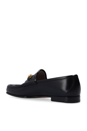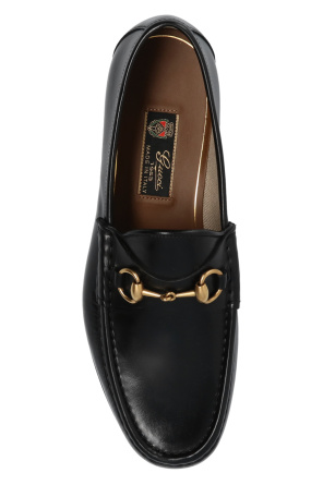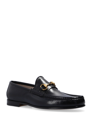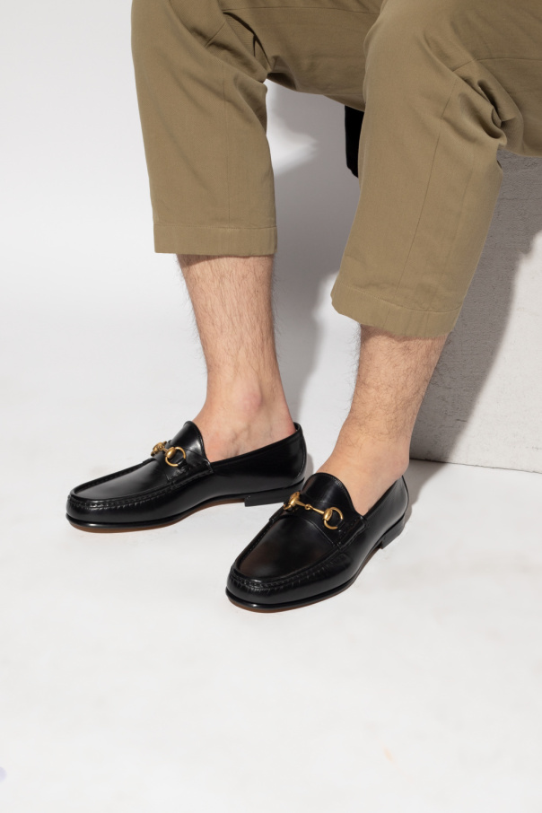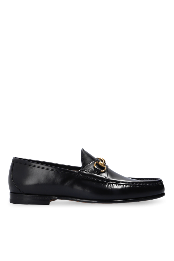 Gucci的黑色乐福鞋。皮革质。金色调horsebit样式。棕色皮革鞋底。