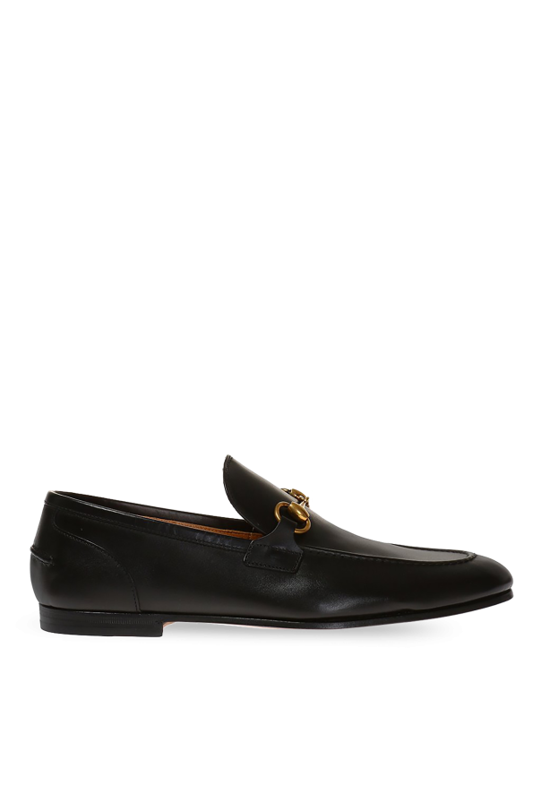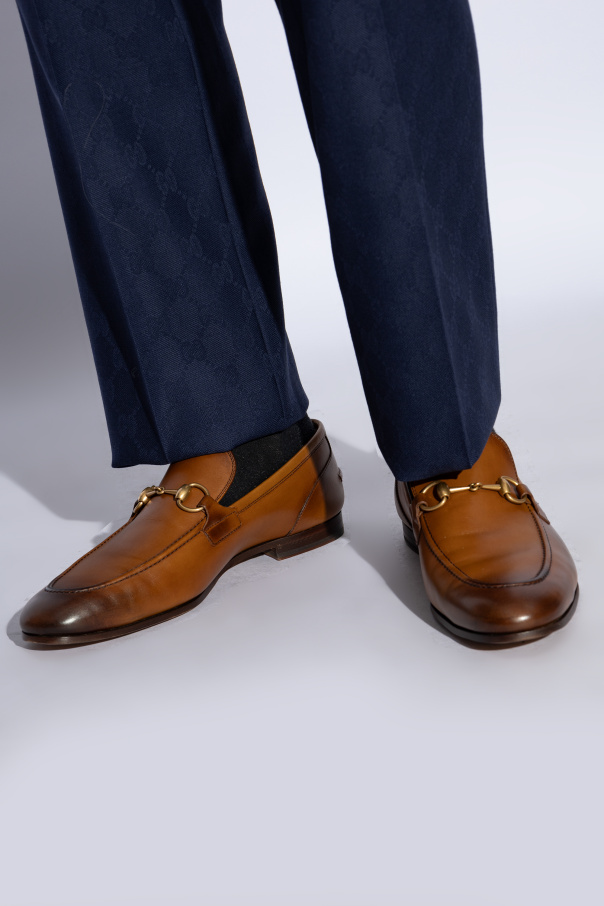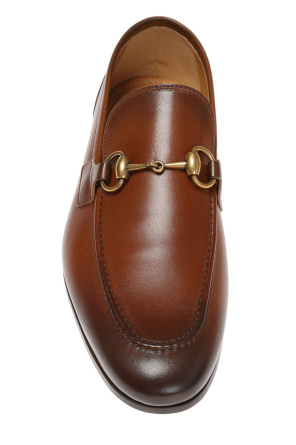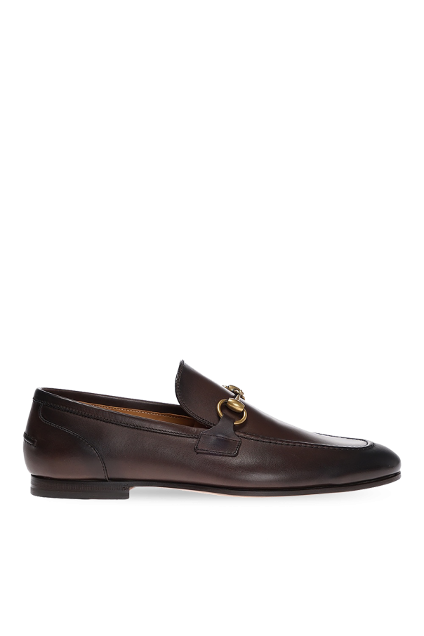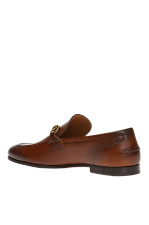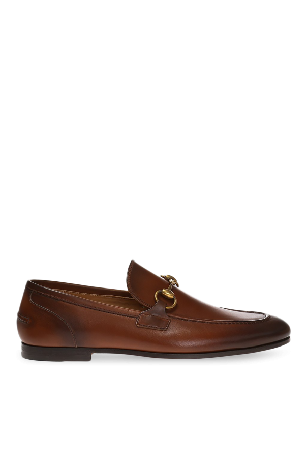 古驰(Gucci)棕色“Jordaan”乐福鞋。天皮制。上面有金色金属马衔装饰。棕色皮革鞋底。