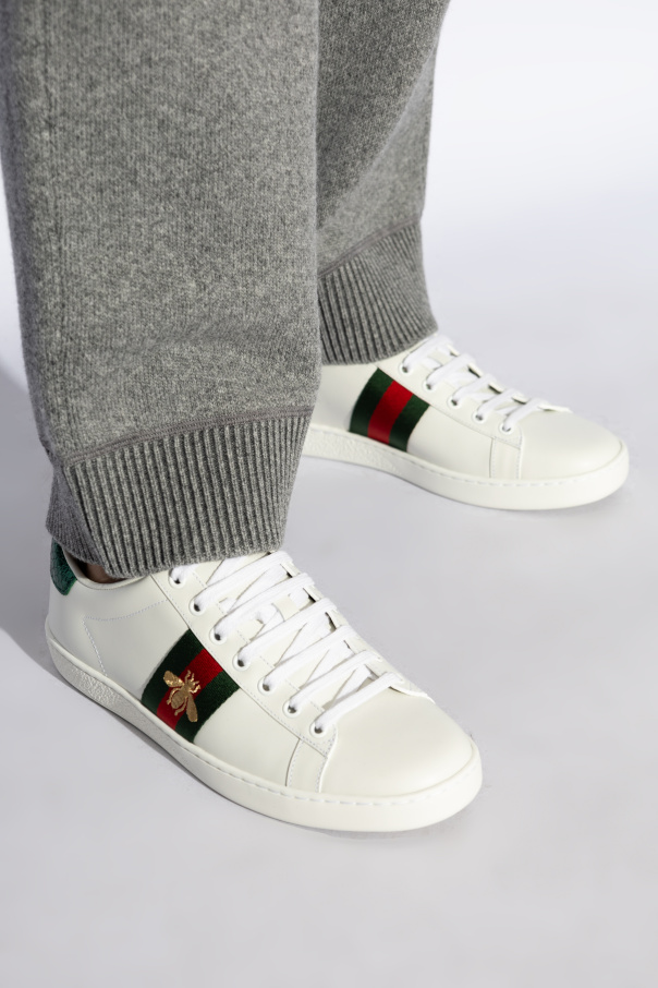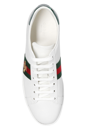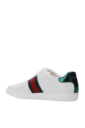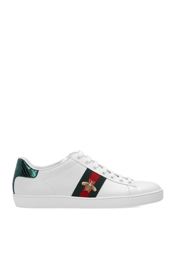 Gucci的白色Ace系带运动鞋。饰有品牌标志性的绿色红色绿色Web条纹,侧面附蜜蜂图饰。具有金属质绿色蛇皮视觉效果。鞋跟处附装饰物。白色橡胶鞋底。