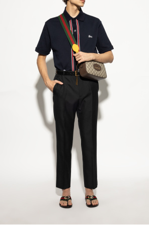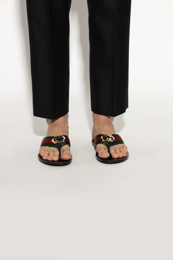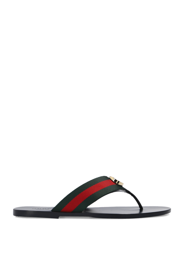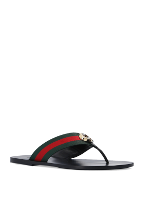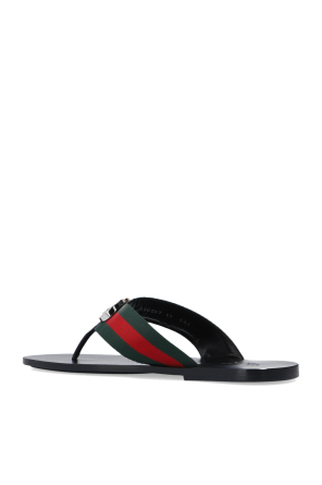 Gucci的黑色人字拖鞋。饰有绿色红色及绿色的品牌标志性Web条纹,含复古金色调金属logo。皮革质。黑色皮革及橡胶质鞋底。