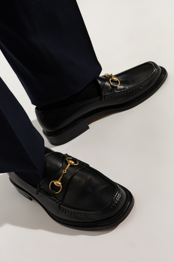 Gucci的黑色皮革材质乐福鞋。配有品牌标志性的金色马衔扣和米色皮革鞋底。