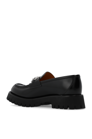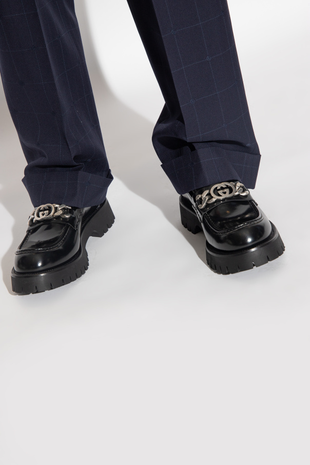 Black shoes from Gucci. Made of leather, this model sits on a black rubber sole and showcases antiqued silver-tone monogram hardware.