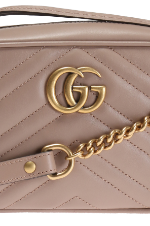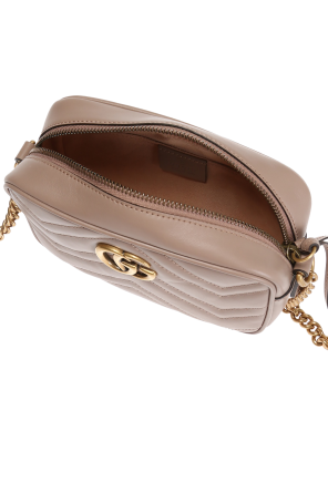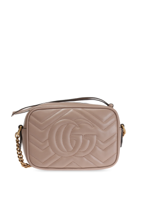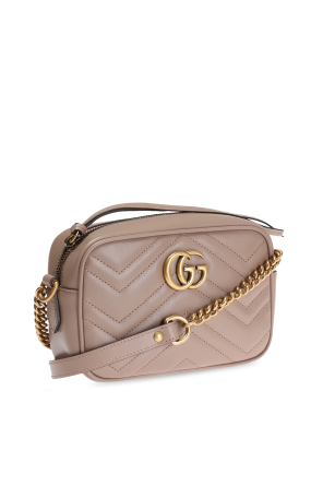 古驰(Gucci)米色 GG Marmont 夹棉挎包。皮革制造。滑扣合口。正面有金属标识。米色衬里内带1只滑袋。复古金质金属配件。