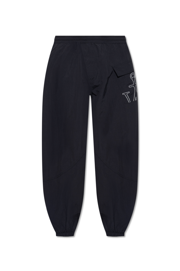 Black track pants from JW Anderson. Cut with a relaxed fit, this pair features a drawstring waistband, two slip pockets, ribbed cuffs, two slip pockets and an asymmetrical flap pocket with white logo embroidery on the front.