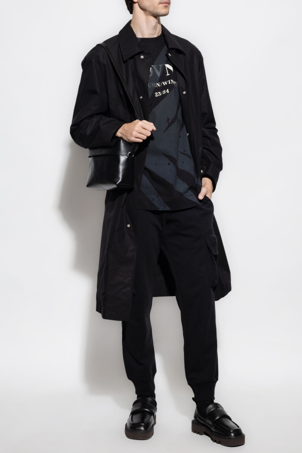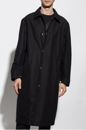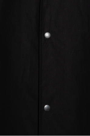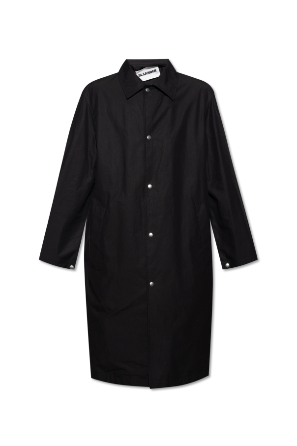 Black coat from Jil Sander. Made of cotton with a single-breasted silhouette, this style fastens with snaps and features a printed white logo at the back, two slip pockets and long sleeves with snap-fastened cuffs.