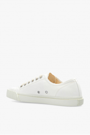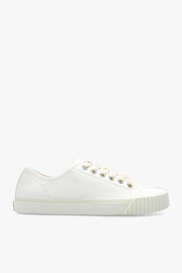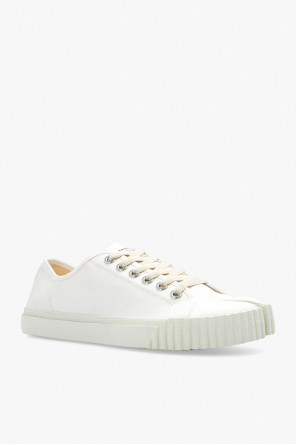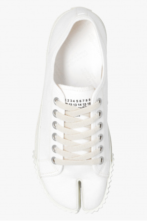 Cream shoes from Maison Margiela. Crafted from cotton, this lace-up pair features a Tabi toe, logo-printed tongue and beige rubber sole.