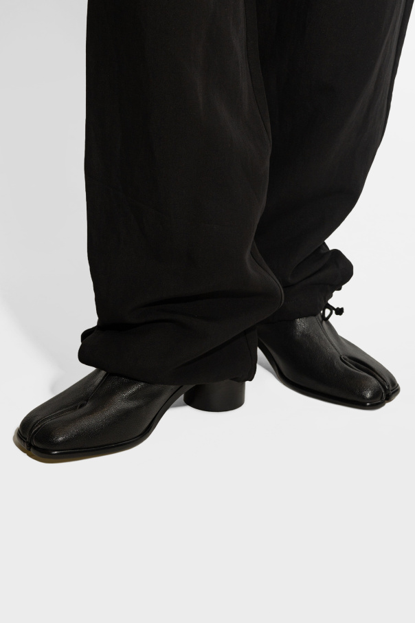 Black heeled ankle boots from Maison Margiela. Made of leather, this pair features hook fastenings with a concealed placket, the brand's signature Tabi split toe and beige leather sole.