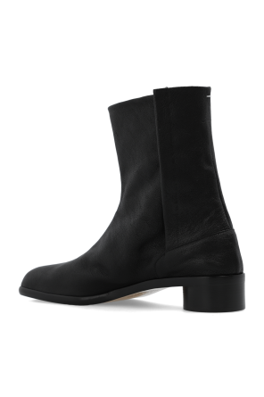 Maison Margiela的黑色高跟踝靴,采用皮革制成,侧面配有钩扣、品牌标志性 Tabi 脚趾和米色皮革鞋底。
