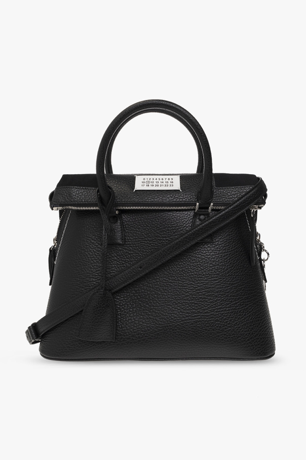 Maison Margiela的黑色'5AC Medium'皮革质单肩包。附拉链开合。饰有白色和黑色徽标贴片、两个半圆形提手、可拆卸肩带、银色金属配件以及一个带一个插袋和一个拉链袋的内部隔层。